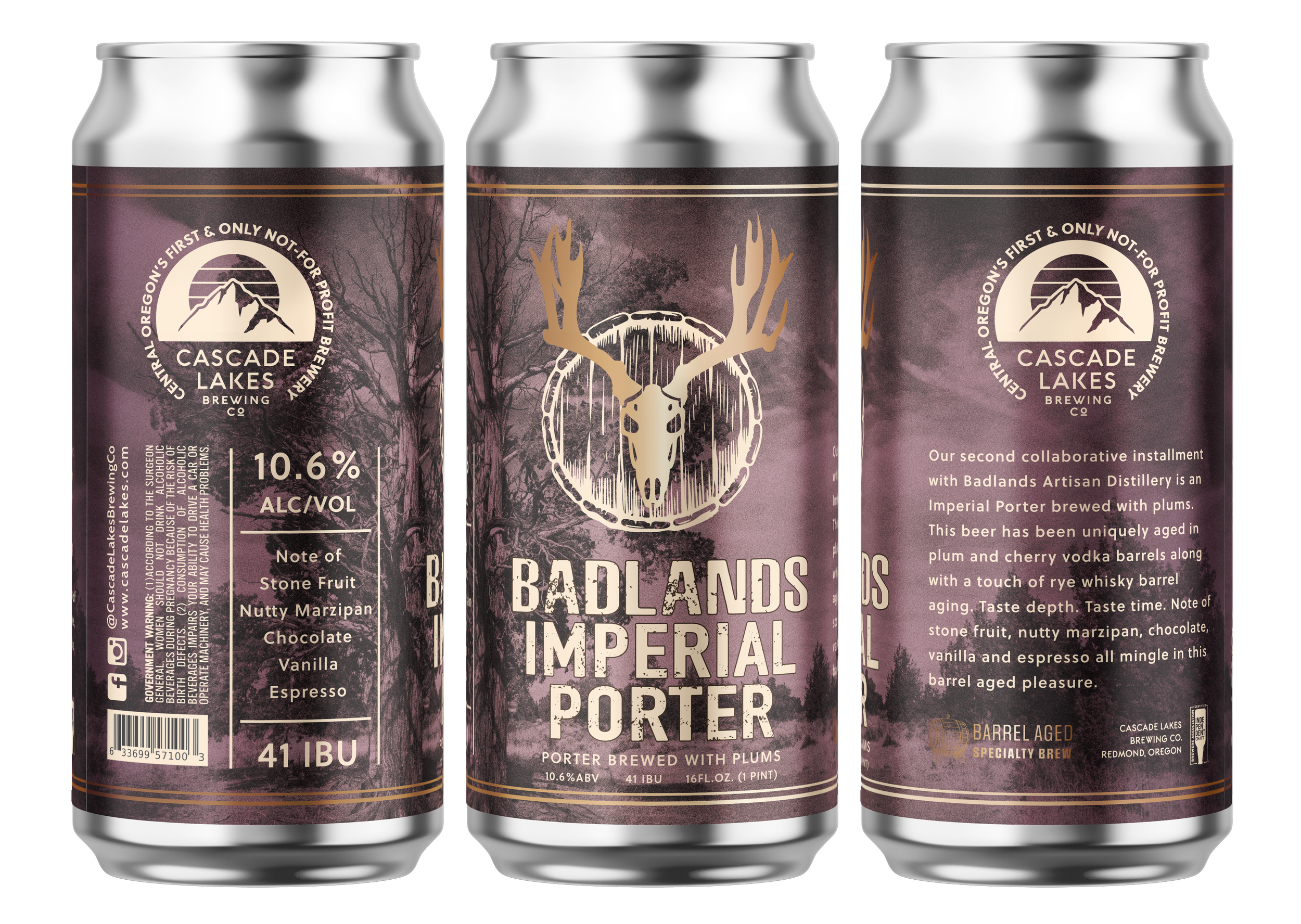 We partnered with our friends at Badlands Artisan Distillery in La Pine, Oregon to create the non-typical beer. A bold, imperial brown ale aged in Double Barrel Rye casks. Audacious vanilla and graham cracker flavors are layered with hints of candid nuts and dark molasses while notes of coconut and lightly spiced honey dance on your tongue.